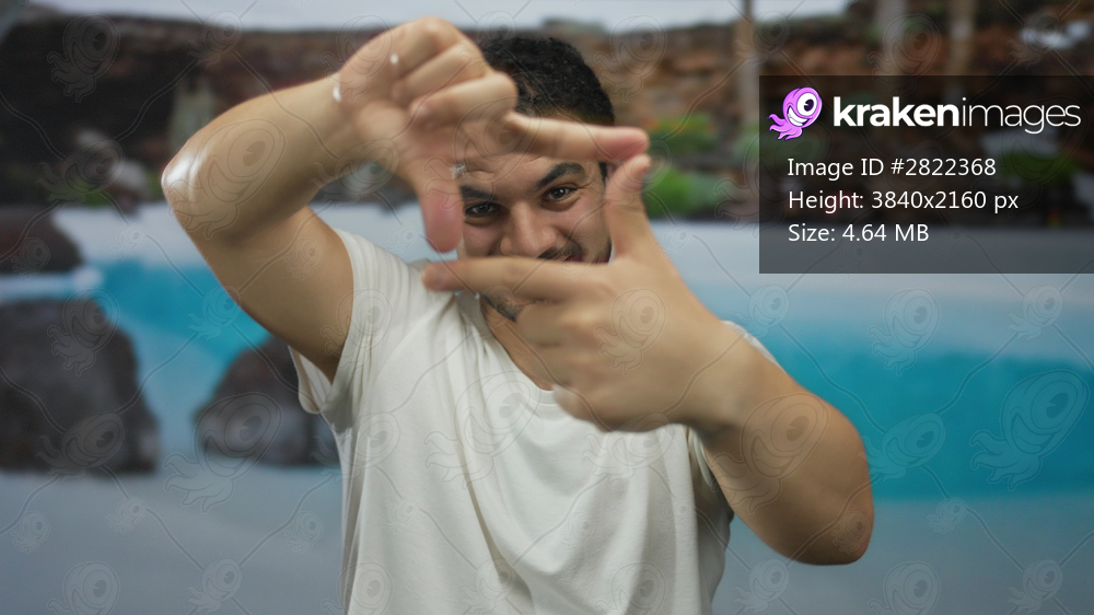 Man in white tshirt smiling and framing blue pool with fingers at resort edge on sunny afternoon; joy.