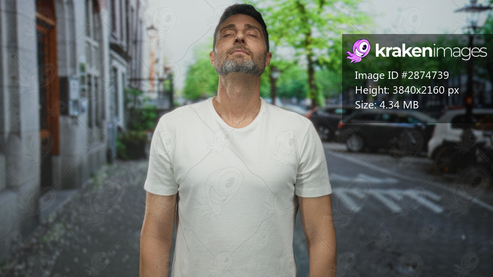 Man in white tshirt with trimmed beard and bare neck, head tilted back and eyes closed, standing midblock beside parked cars on street; serenity calm reflection. - Kraken Images