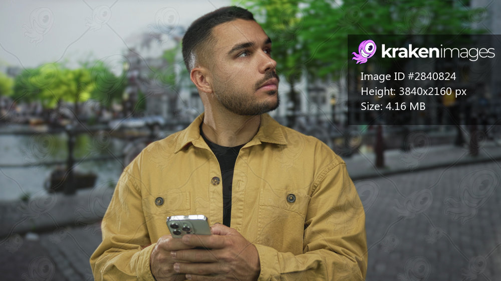 Man in yellow jacket with beard holds smartphone and looks up on street beside canal; contemplation.