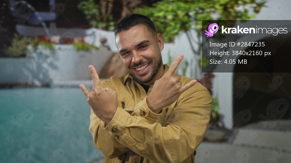 Man in yellow jacket grins and confidently flashes rock horns with both hands by sunlit pool building; fun.