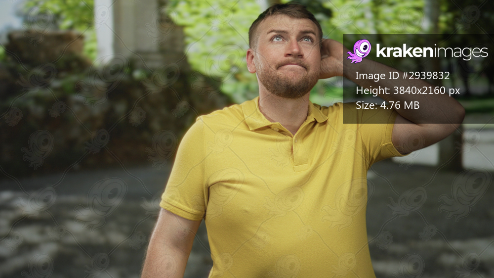 Man in yellow polo shirt with hand on cheek and hand behind neck, grimacing while standing on a tree lined park path; toothache discomfort.