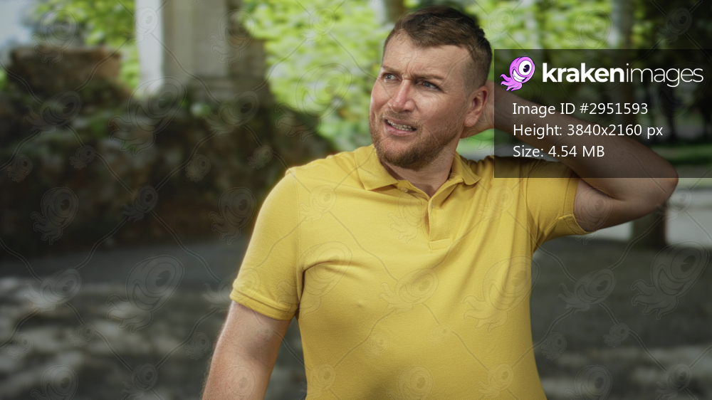 Man in yellow polo shirt with hand on cheek and hand behind neck, grimacing while standing on a tree lined park path; toothache discomfort.