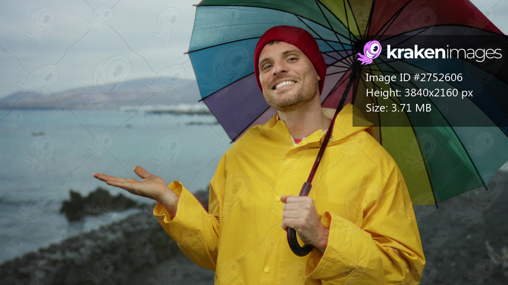 Man in yellow raincoat holding colorful umbrella, smiling at seaside with mountains in background, showcasing a cheerful vibe by the water with arm extended. - Kraken Images