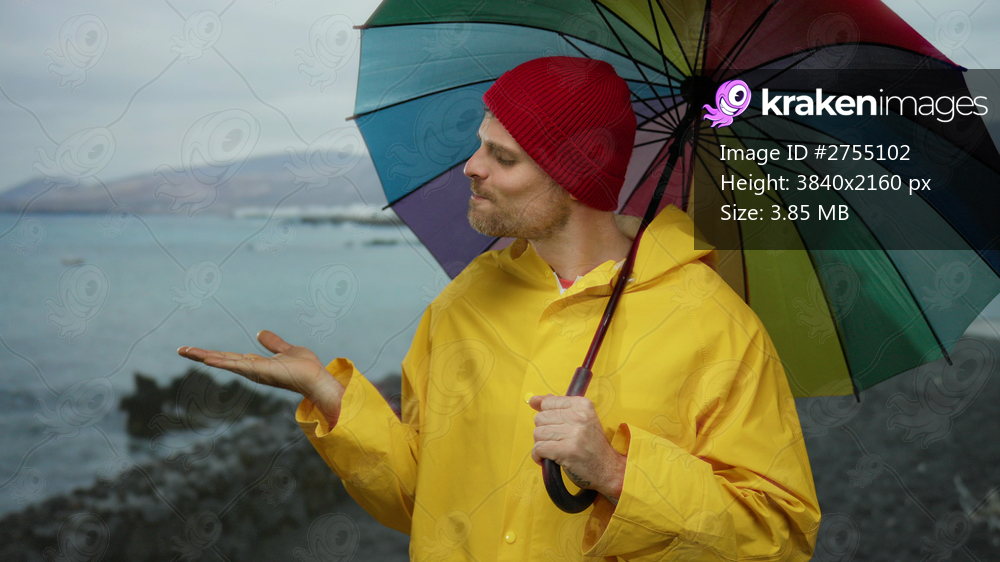 Man in yellow raincoat holding colorful umbrella, smiling at seaside with mountains in background, showcasing a cheerful vibe by the water with arm extended. - Kraken Images