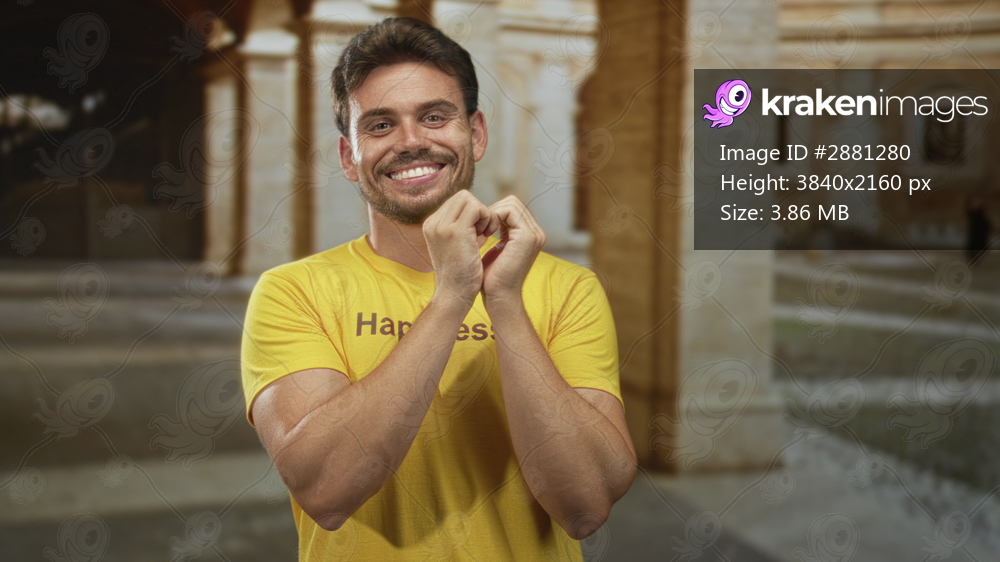 Man in yellow shirt forming heart with hands on old town street, smiling warmly; affection connection happiness.