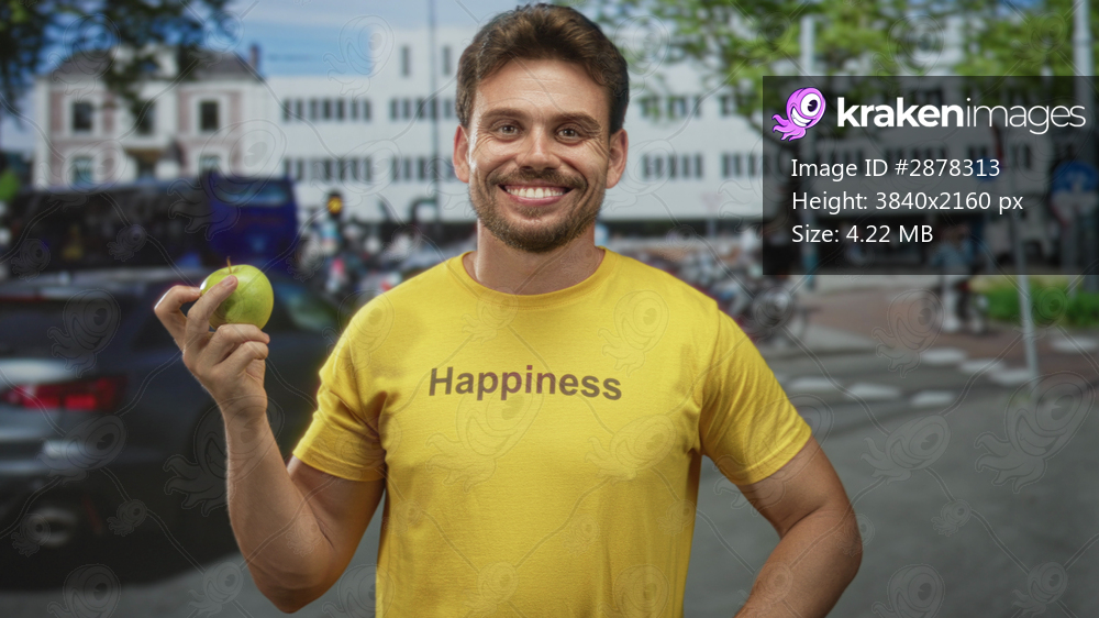 Man in yellow shirt holding a green apple in his left hand on a busy street, smiling at camera amid cars and bicycles; happiness.