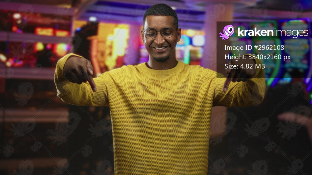 Man in yellow sweater and glasses smiling while pointing fingers down at slot machines in building interior; confidence celebration.