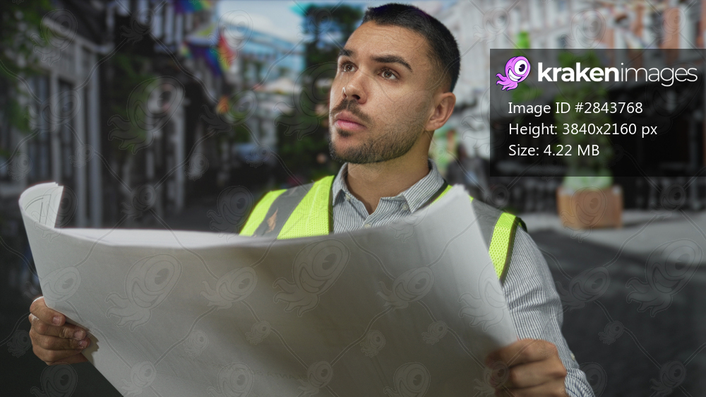 Man in yellow vest holding unfurled blueprint and gazing up on sunlit street; project vision ambition.