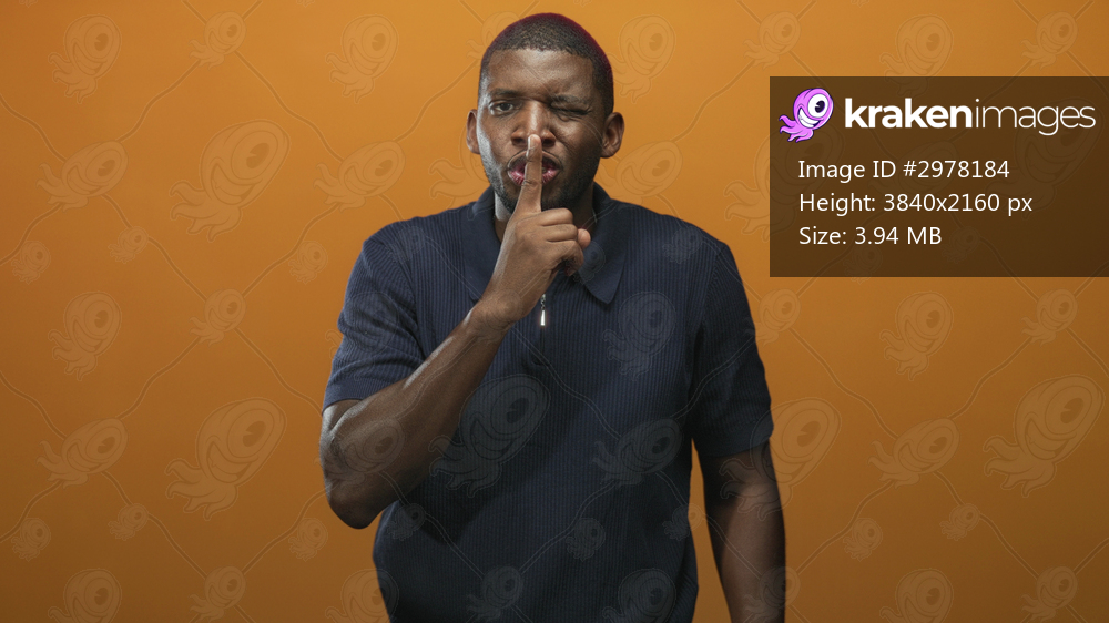 Man with index finger to lips for silence in studio, winking with one eye closed, full torso visible wearing navy polo against orange backdrop; playful secrecy. - Kraken Images