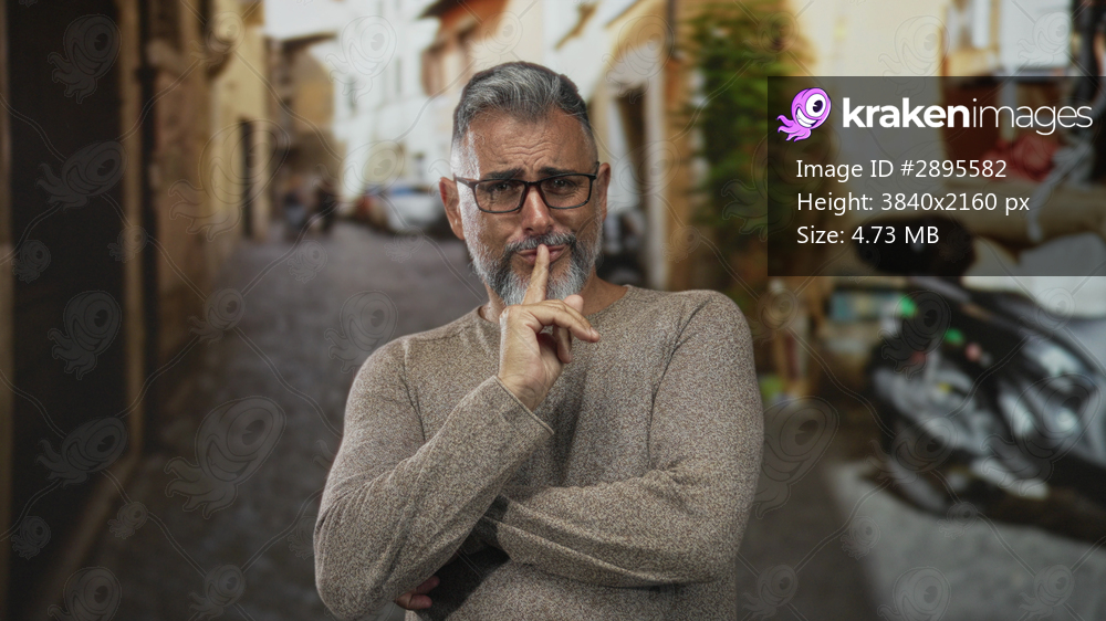 Man with index finger to lips for silence on a narrow city street, wearing glasses and sweater, beard visible; playful secrecy.