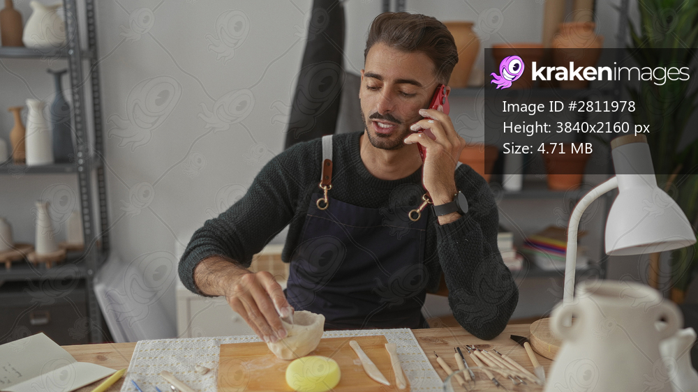 Man kneads a small clay bowl with hands and holds phone to ear in a workshop studio; craftsmanship focus.