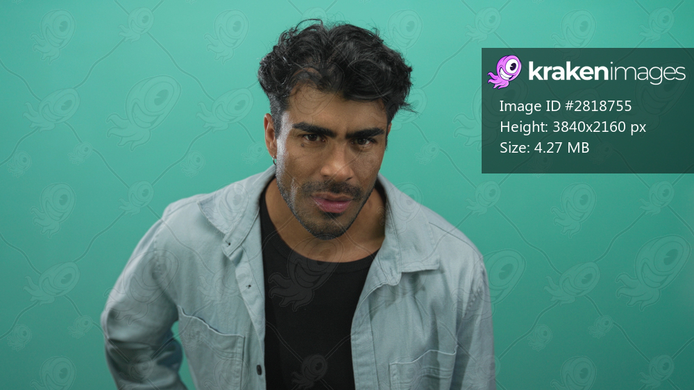 Man knocking fist against glass wall in a teal studio; curiosity concentration listening investigation.