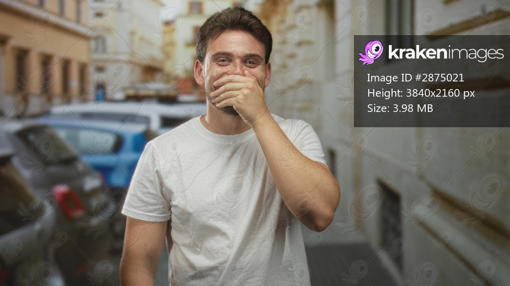 Man laughing and covering mouth with hand on a narrow city street beside parked cars, leaning forward; amusement.