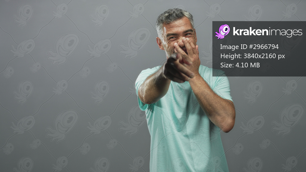 Man laughing and covering mouth with hands while pointing finger in studio; joy playfulness surprise.