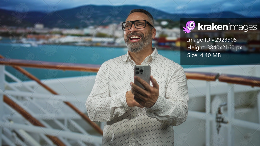 Man laughing and holding smartphone with both hands on cruise ship deck railing while wearing glasses and a patterned shirt; happiness.