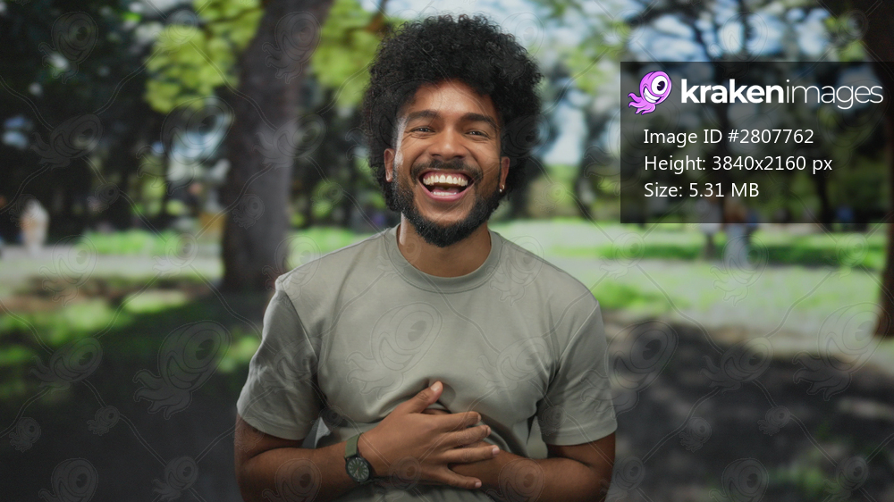 Man laughing in a green park with trees and sunlight creating a cheerful outdoor ambiance capturing joyful expression and natural setting.