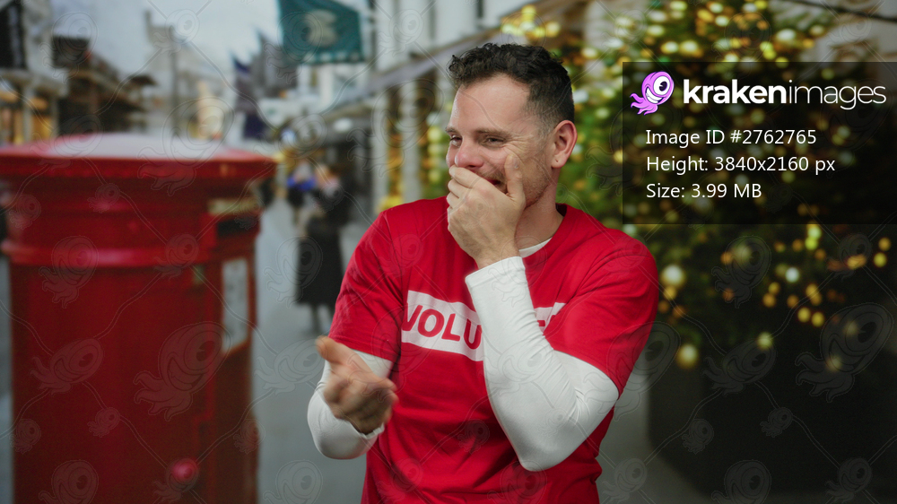Man laughing joyfully in city street wearing red shirt with holiday decorations and british postbox in background during festive season.