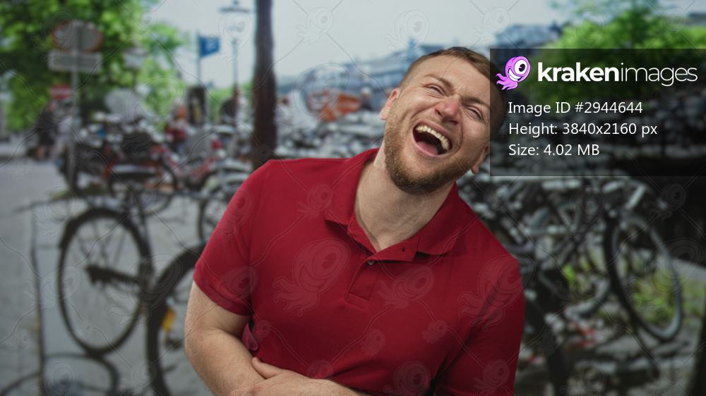 Man laughing with mouth open and head tilted back in a red polo on a street lined with bicycles in amsterdam; joy carefree spontaneous humor.