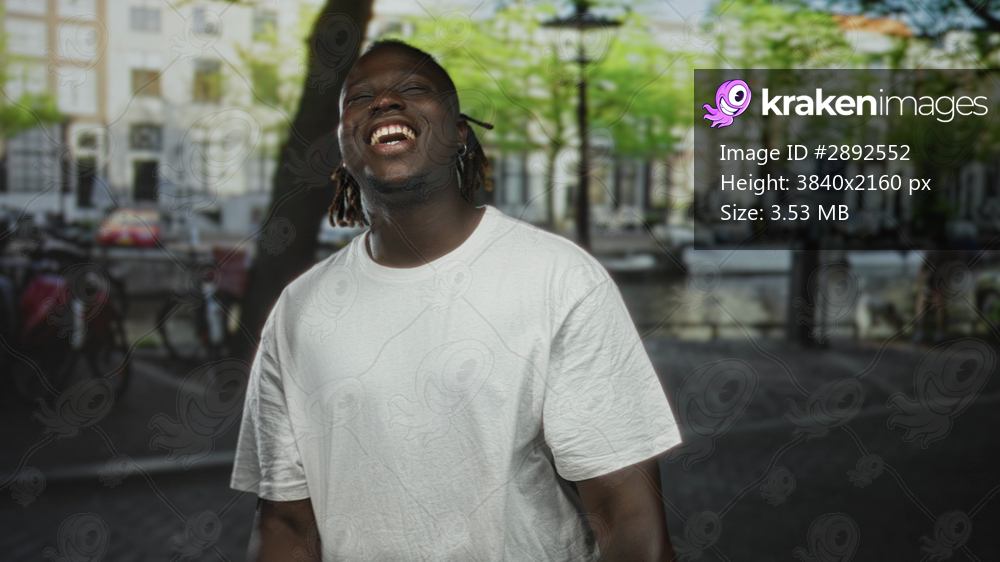 Man laughing with smiling face and hand on chest on street by an amsterdam canal with bicycles and boats, wearing white tshirt and dreadlocks; joy.