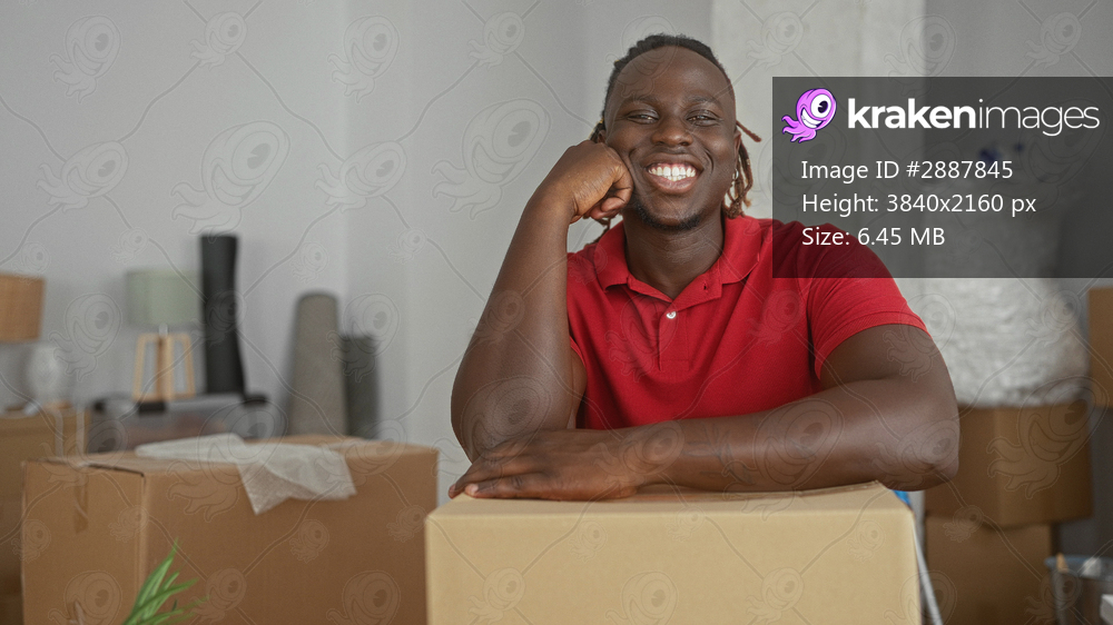 Man leaning on a cardboard box, hand on chin and arm resting across the box in a new home surrounded by moving boxes; fresh start contentment.