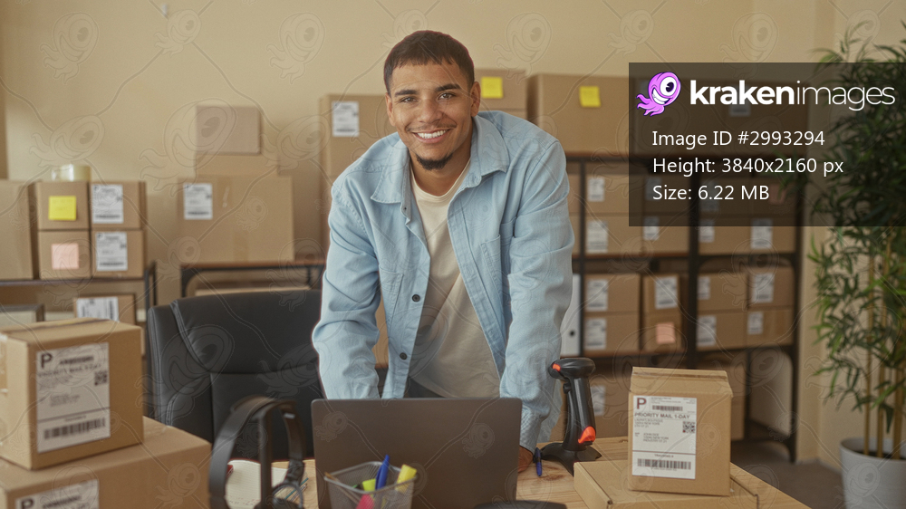 Man leaning on desk with shipping boxes and barcode scanner in building; entrepreneurial small business pride.