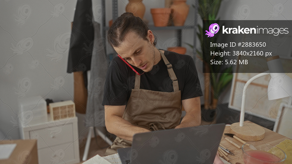 Man leaning over a laptop holding a phone to his ear in an artisan studio surrounded by clay pots and tools; concentration productivity.