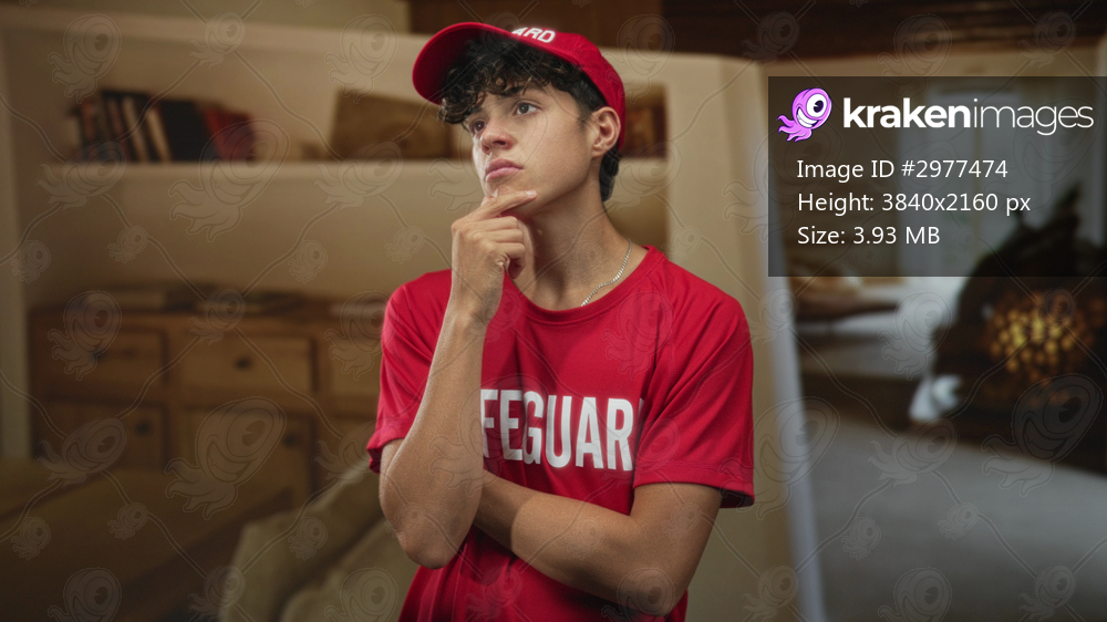 Man lifeguard finger to chin wearing red lifeguard shirt and cap in building; contemplation reflective.