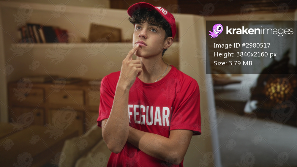 Man lifeguard finger to chin wearing red lifeguard shirt and cap in building; contemplation reflective.