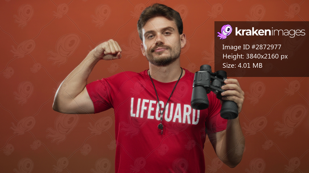 Man lifeguard flexes bicep and holds binoculars in studio orange backdrop, wearing red lifeguard shirt and whistle on lanyard; confidence duty.