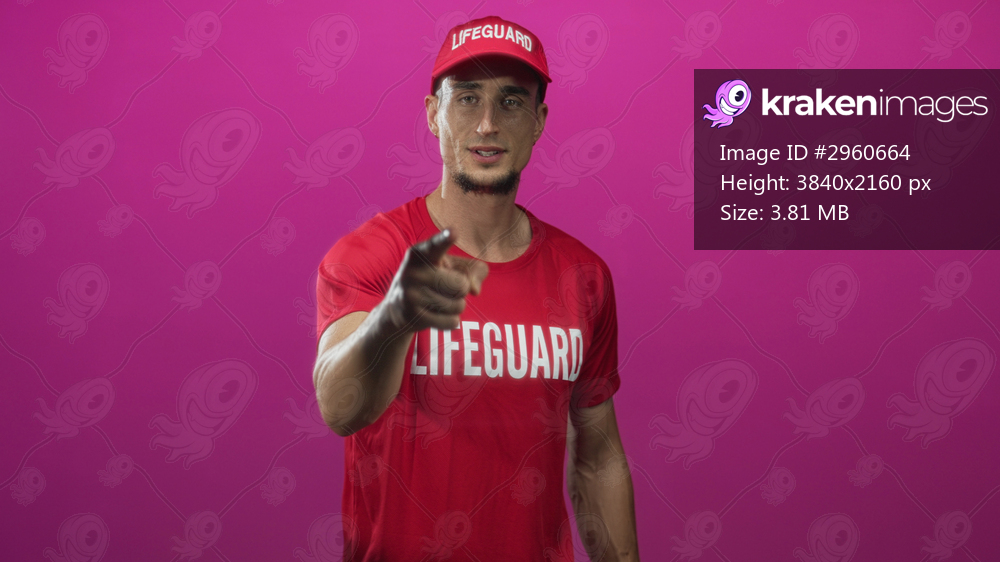 Man lifeguard flexes biceps and clenches fists while smiling, wearing lifeguard cap and shirt in studio; confidence.