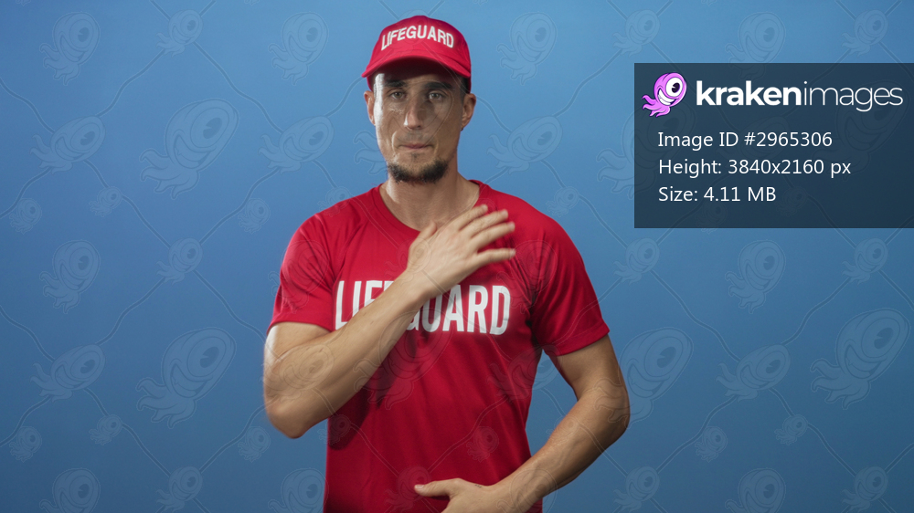 Man lifeguard in red cap and shirt places hand on chest and adjusts hat in studio; duty calm vigilance.