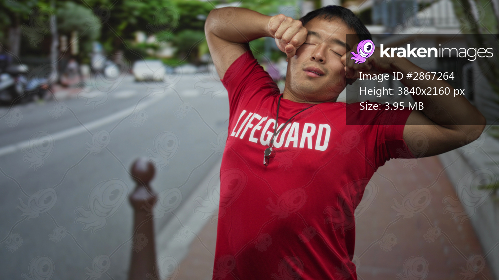 Man lifeguard in red lifeguard shirt flexes arm muscles and rubs eyes under pendant whistle on street; exhaustion strain.