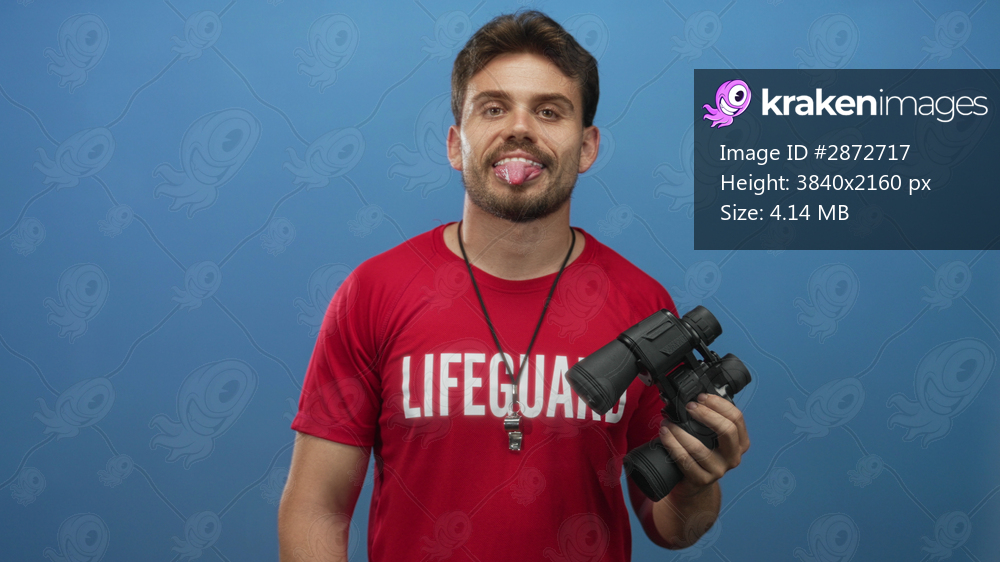 Man lifeguard in red lifeguard shirt holding binoculars and whistle, sticking tongue out toward camera in blue studio; playful confidence.
