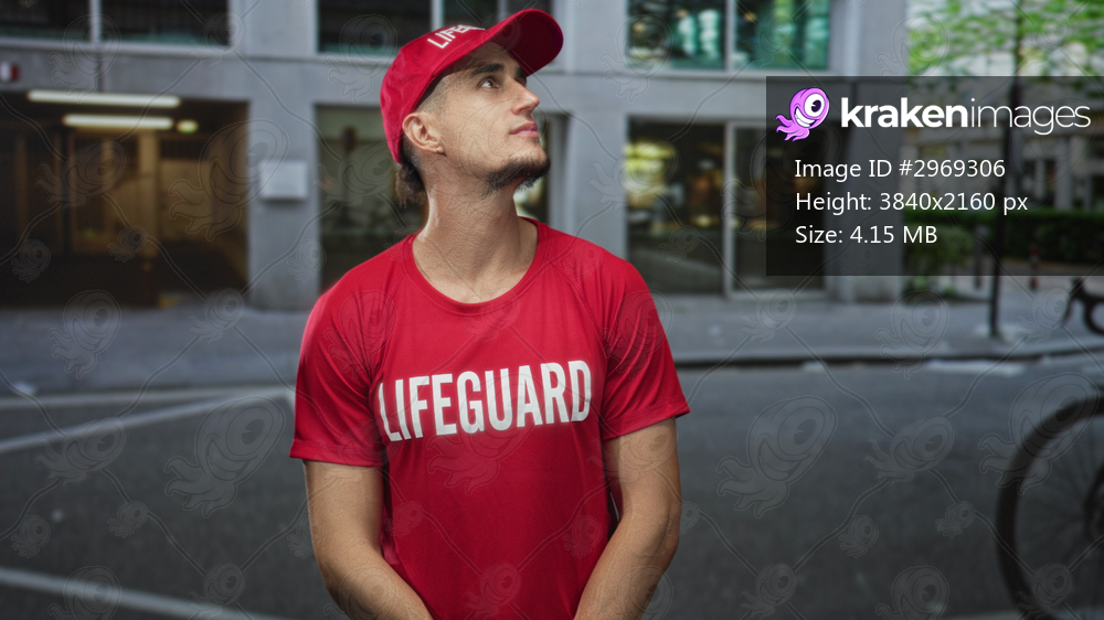 Man lifeguard in red shirt and cap looks upward with hands loosely clasped, standing by a street building facade; duty vigilance.