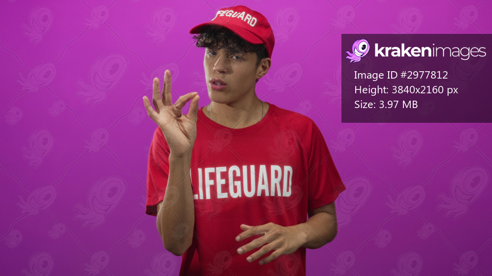 Man lifeguard in red shirt and cap shows ok hand sign with fingers visible in studio; confidence duty.