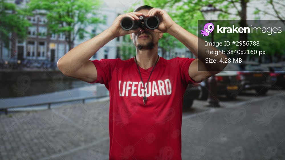 Man lifeguard in red shirt holding binoculars with hands raised on street near canal and parked cars; alert duty.
