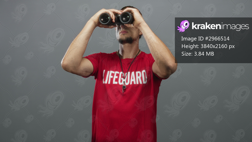 Man lifeguard in red shirt holding binoculars to his eyes, whistle on a cord at his chest, arms raised against a neutral studio backdrop; vigilance duty. - Kraken Images