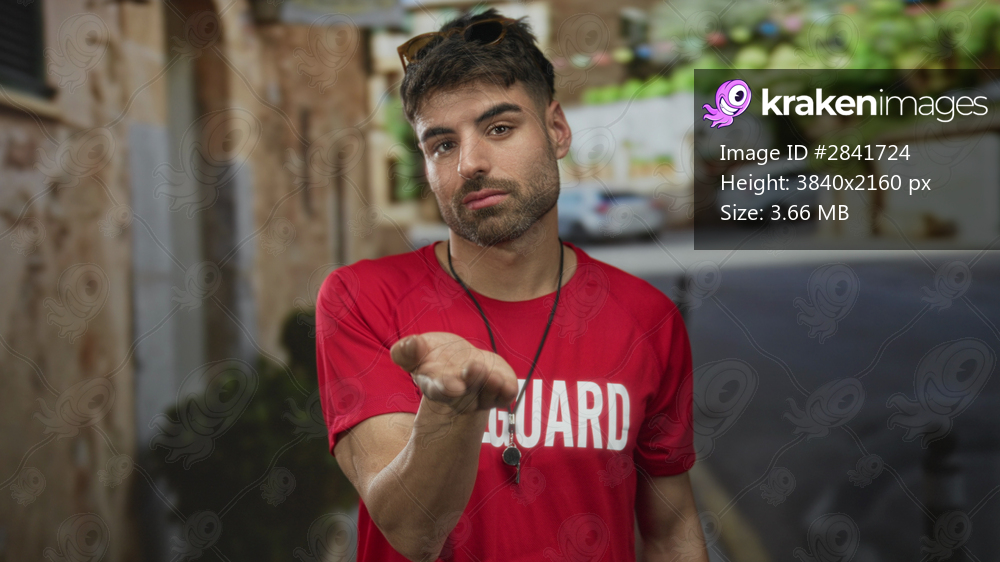 Man lifeguard in red shirt holds palm out on old town street with stone building behind; invitation.