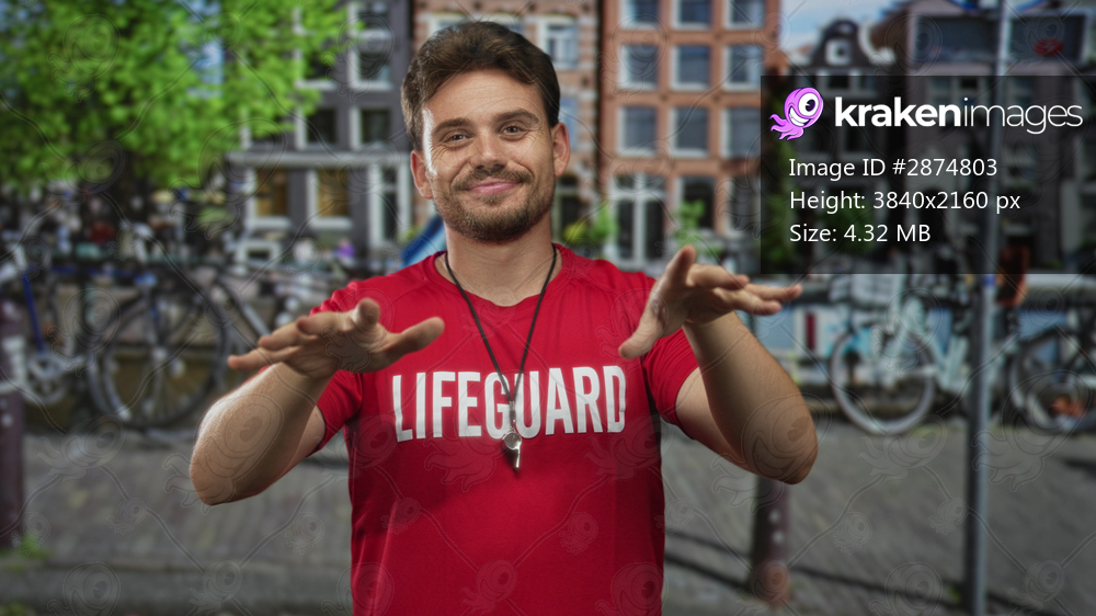 Man lifeguard in red shirt with lifeguard text and whistle, hands reaching forward in an open gesture on a street by canal buildings in amsterdam; confidence. - Kraken Images
