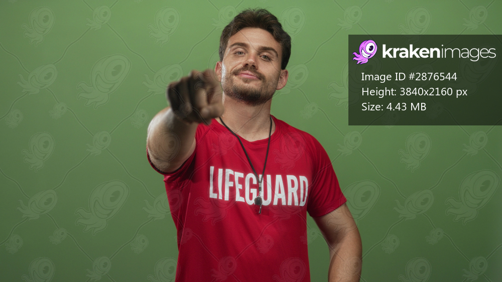 Man lifeguard in red shirt points finger with whistle visible in green studio; confidence duty rescue leadership.