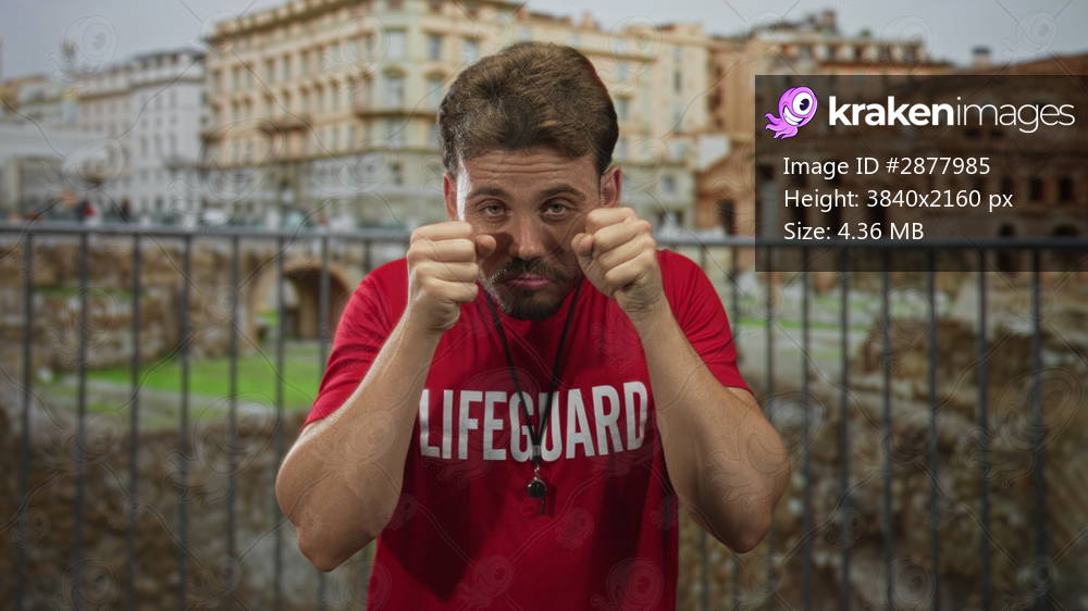 Man lifeguard in red shirt rubbing eyes with fists and whistle visible at building ruins; tired duty service.