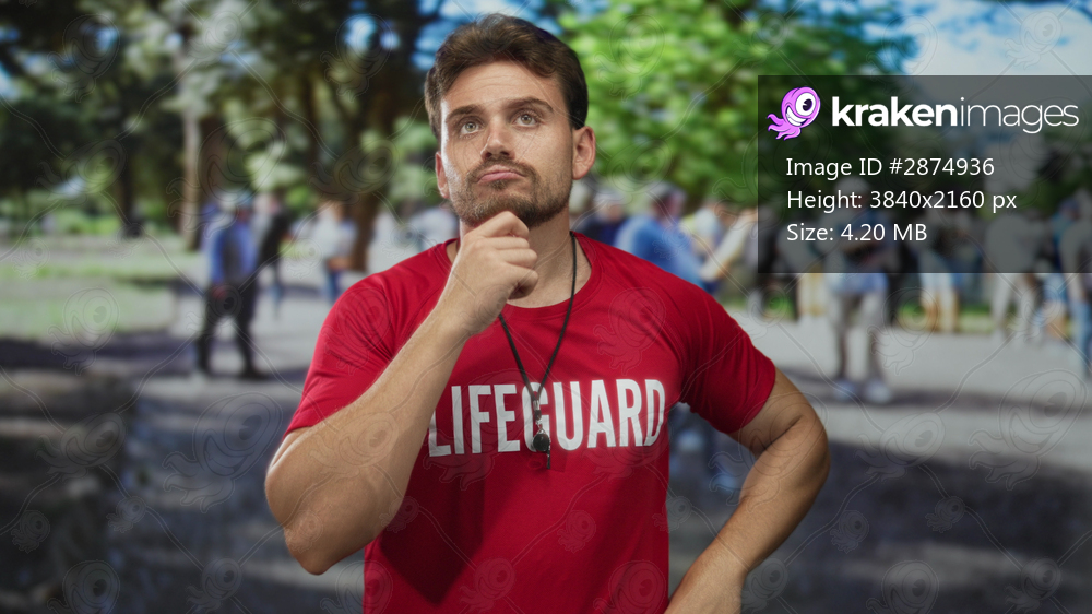 Man lifeguard in red shirt touching chin with whistle visible on park street; thoughtful reflection.