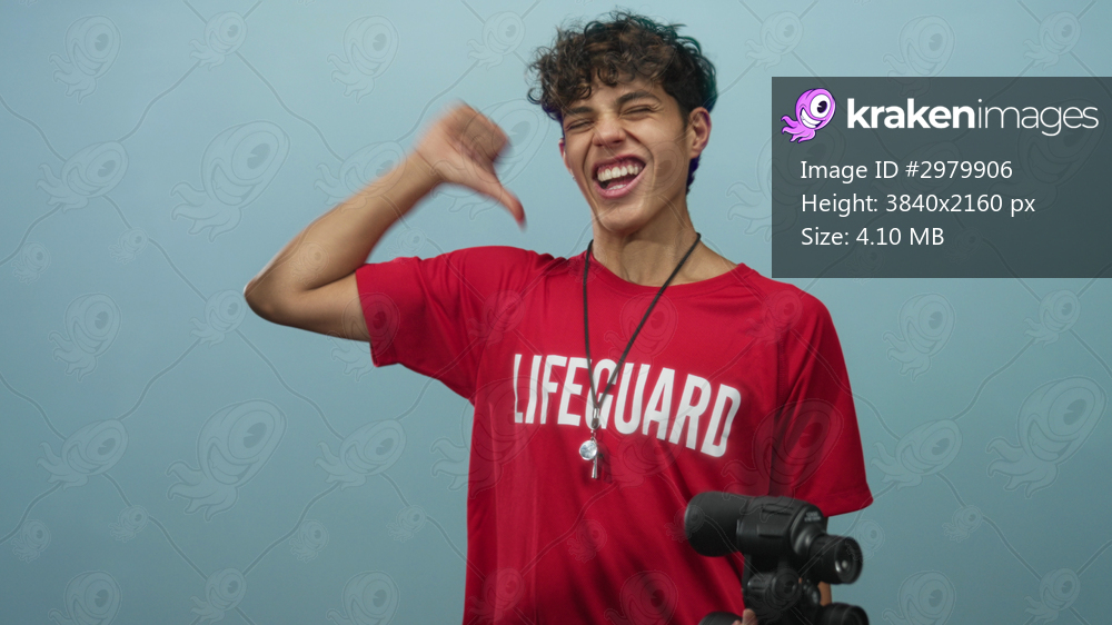 Man lifeguard in red shirt with whistle and binoculars grimacing while pointing thumb to chest against blue studio backdrop; playful defiance.