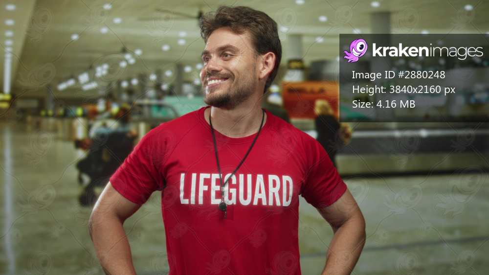 Man lifeguard in red shirt with whistle and hands on hips smiling in airport terminal; confidence duty.