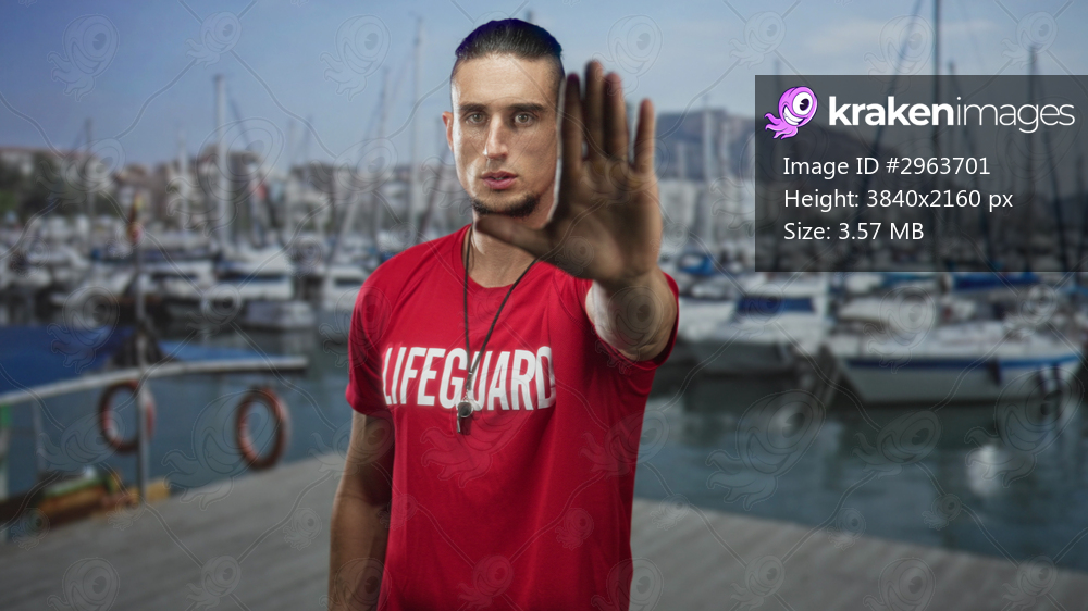 Man lifeguard in red shirt with whistle raising hand palm forward to stop on marina dock pier; vigilance duty.
