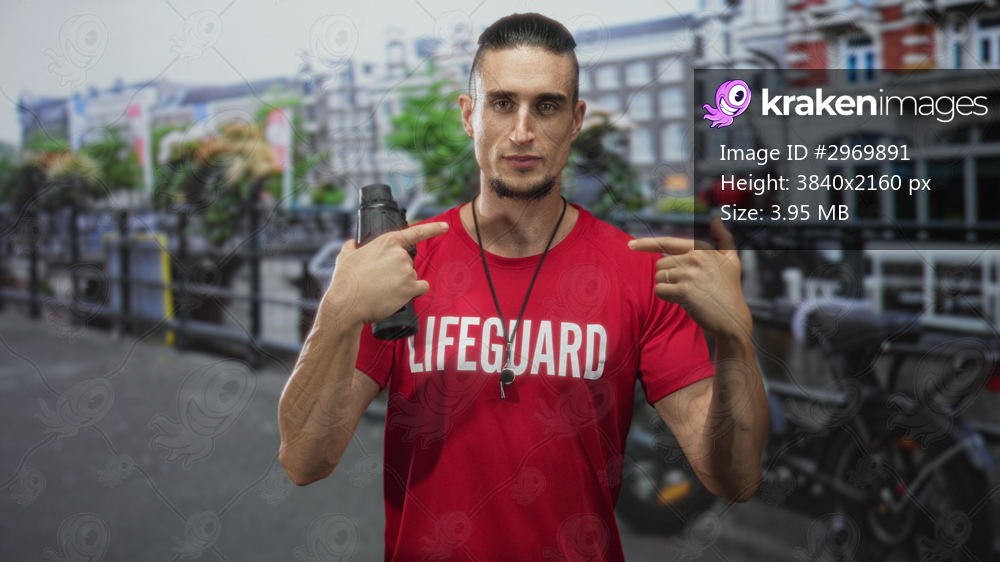 Man lifeguard points finger to chest wearing red lifeguard shirt with whistle and binoculars on street near canal; duty confidence.