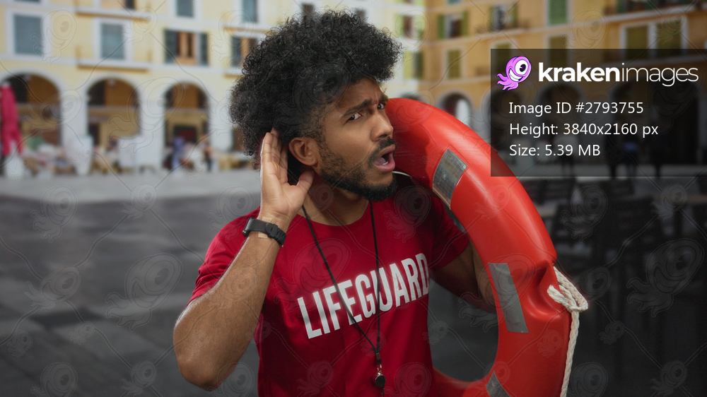Man lifeguard stands outdoors in urban city street holding life preserver and listening attentively amid blurred background of architecture and people. - Kraken Images