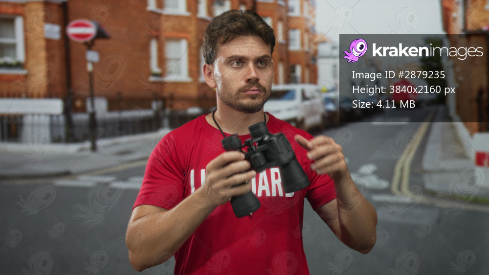 Man lifeguard wearing red shirt with whistle and holding binoculars, forearm exposed, looking to side on street with parked cars and brick buildings; vigilant duty. - Kraken Images