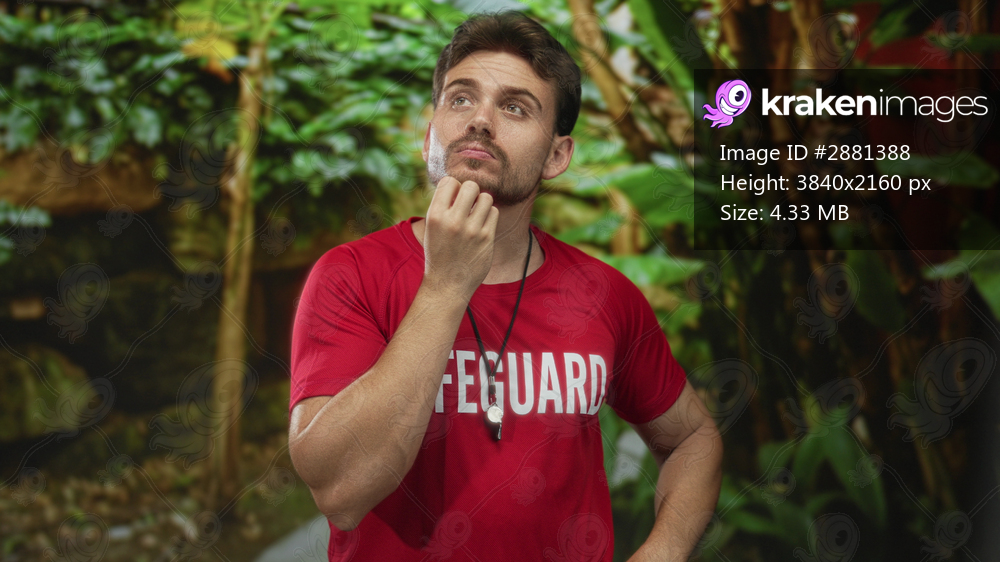 Man lifeguard young hispanic in red shirt with whistle and lanyard, hand on chin near stone path and green trees in forest park setting; thoughtful duty. - Kraken Images