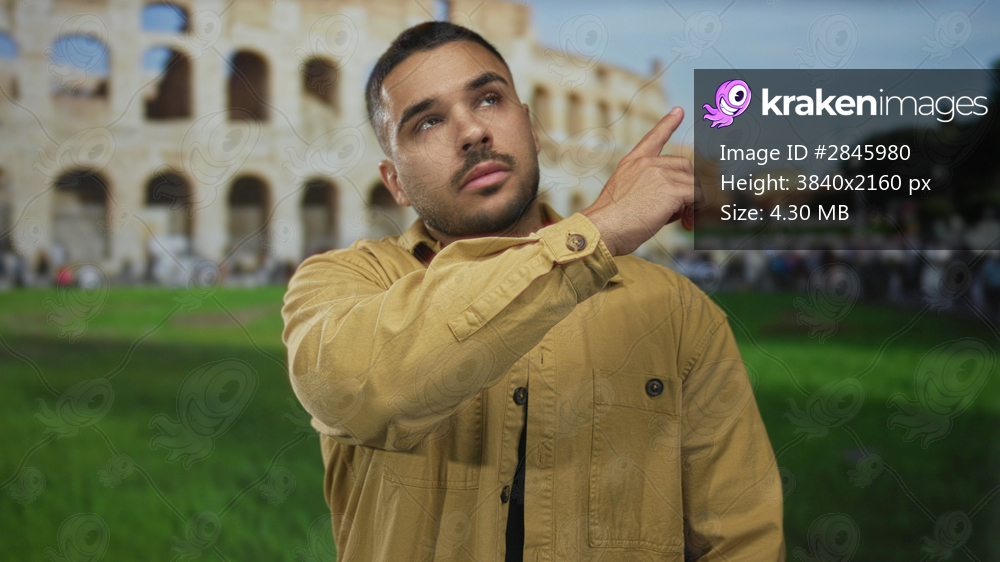 Man lifts finger pointing to ancient roman colosseum building with detailed facade under bright midday sky; wonder.
